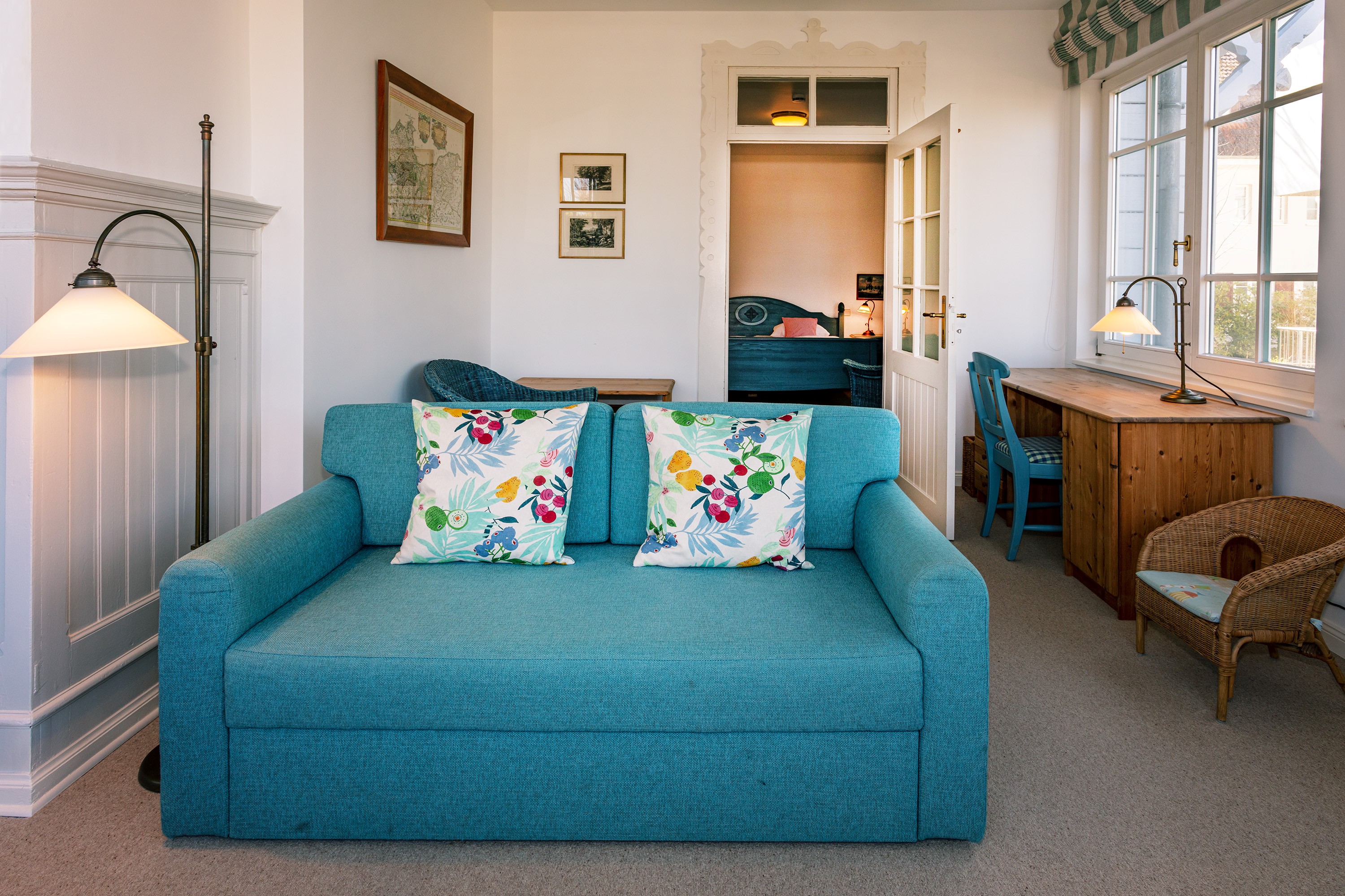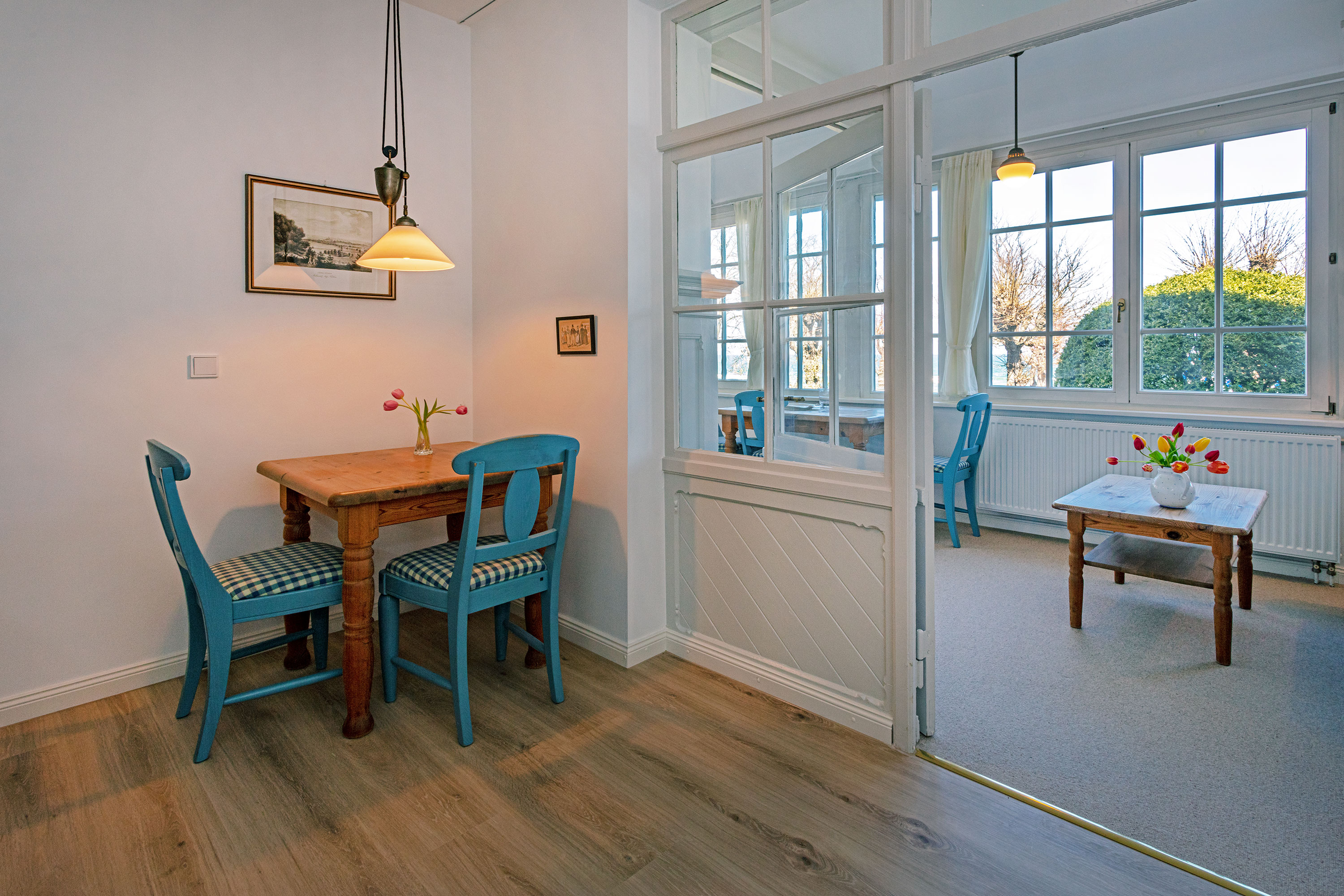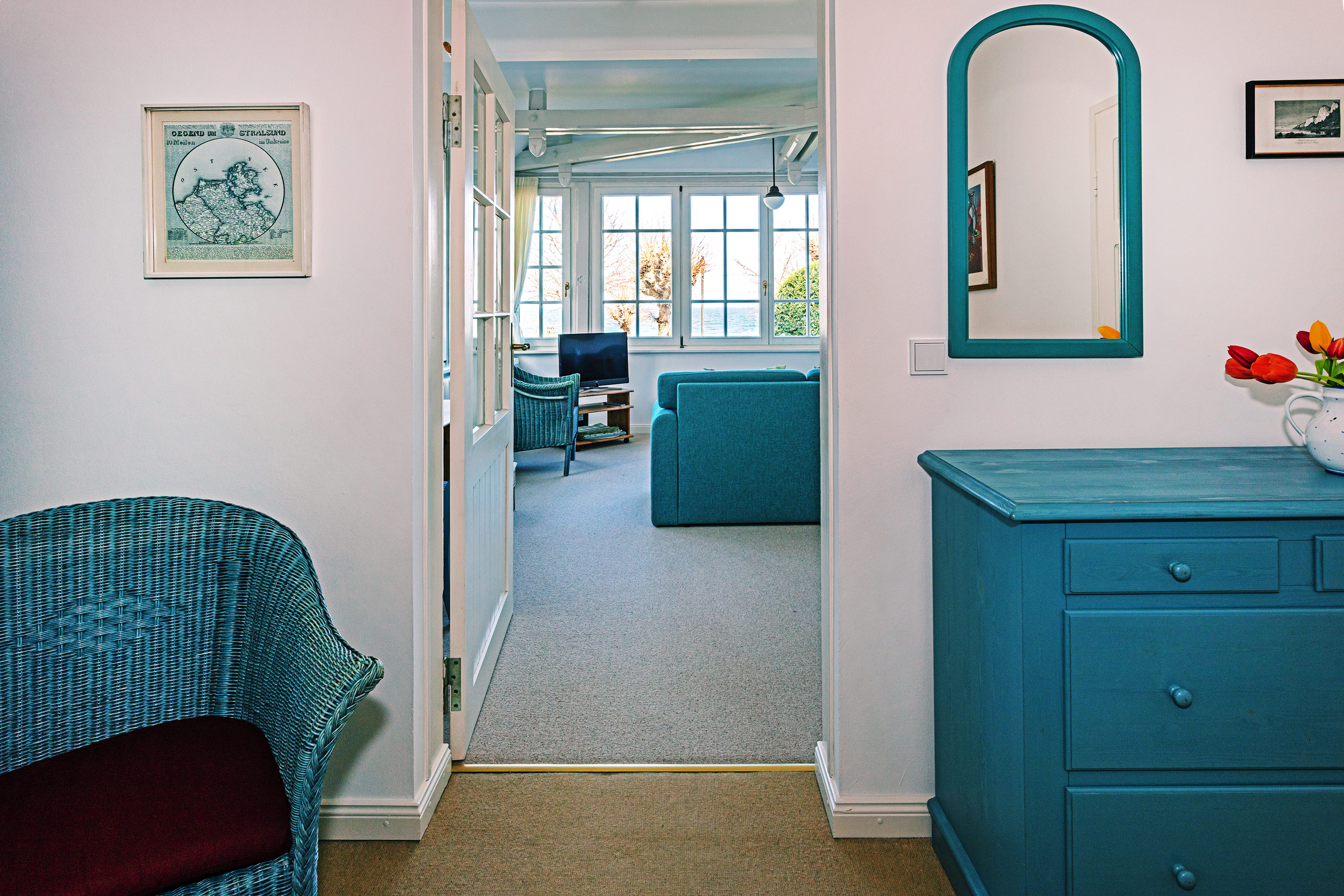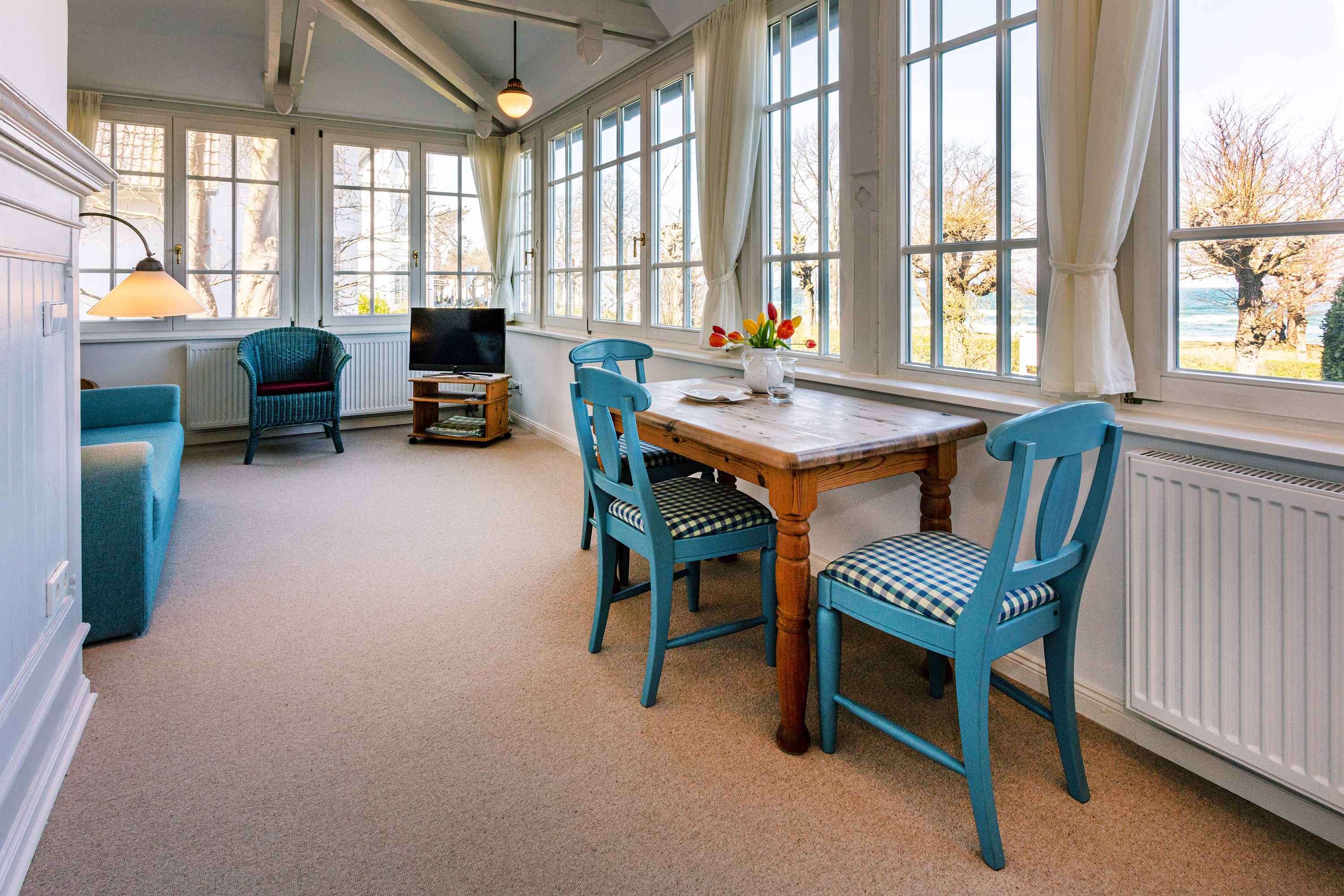Die Wohnung 6 liegt im 1. Geschoss der Villa Ruscha und bietet mit der großen gläsernen Veranda besonders im Winter einen fantastischen Blick auf die Ostsee. Die 2- Zimmer Wohnung bietet Platz für zwei Personen und hat die Möglichkeit zur Aufbettung (Schlafsofa) für einen weiteren Gast.